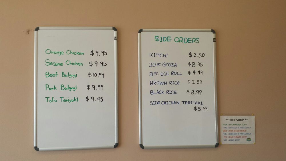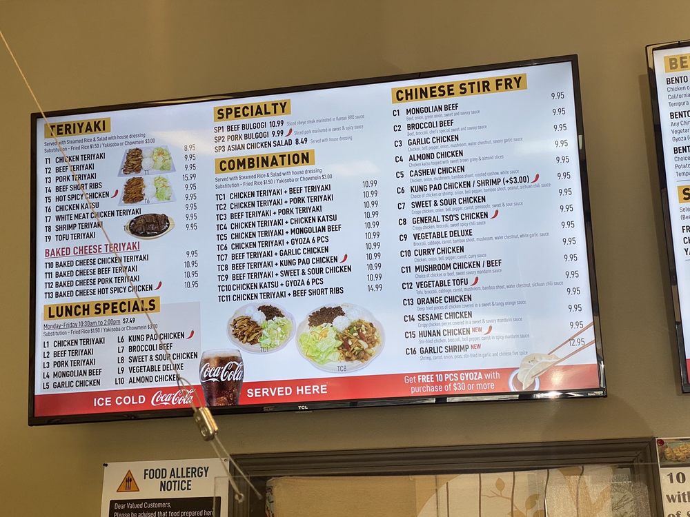 Chicken, beef or pork teriyaki, California roll, 4 pieces gyoza, 2 pieces tempura shrimp, salad and rice.