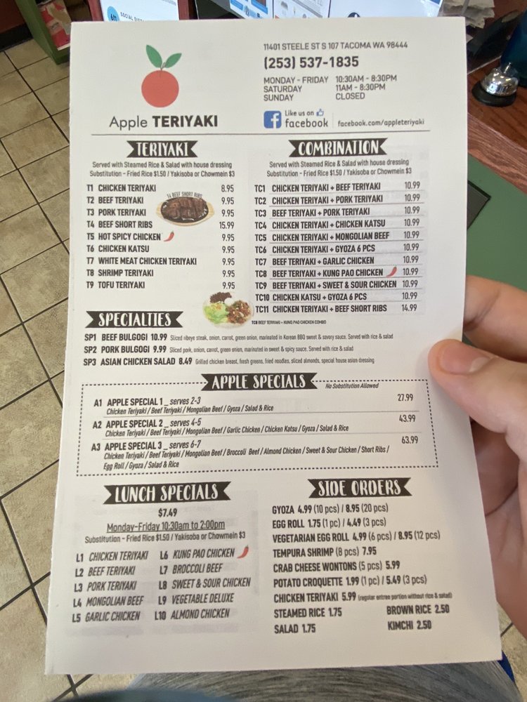 Apple Teriyaki, a Japanese restaurant located in Tacoma, WA, is a hidden gem for those craving delicious and generously portioned teriyaki dishes. With a menu boasting various teriyaki options, from classic chicken and beef teriyaki to unique baked cheese teriyaki variations, there is something for everyone. The combination meals offer great value for money, with ample food to share or save for leftovers. Customers rave about the homemade feel of the teriyaki sauce, praising its balance of flavors. The restaurant's casual ambiance and friendly service add to the overall dining experience. With rave reviews mentioning the excellent shrimp tempura and Mongolian beef combo, Apple Teriyaki is a go-to spot for a satisfying and affordable meal.